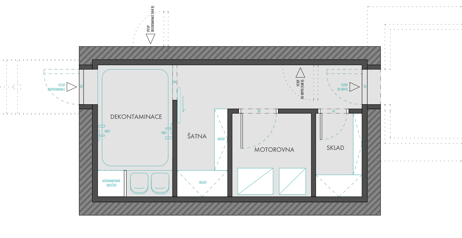 Minimálně tři stupně ochrany,zajištěné vstupní dveře do krytu na schodiště, poté 20cm silné železobetonové dveře do modulu dekontaminace strojovny a části zásob, pak poslední zabezpečené 20 cm železobetonové dveře před obytnou částí , přetlakové protiexplozivní ventily, ochranné systémy. Každý kryt je vybaven minimálně jedním u malých krytů , jinak minimálně dvěmi únikovými východy. U každého únikového východu je připraveno evakuační zavazadlo.